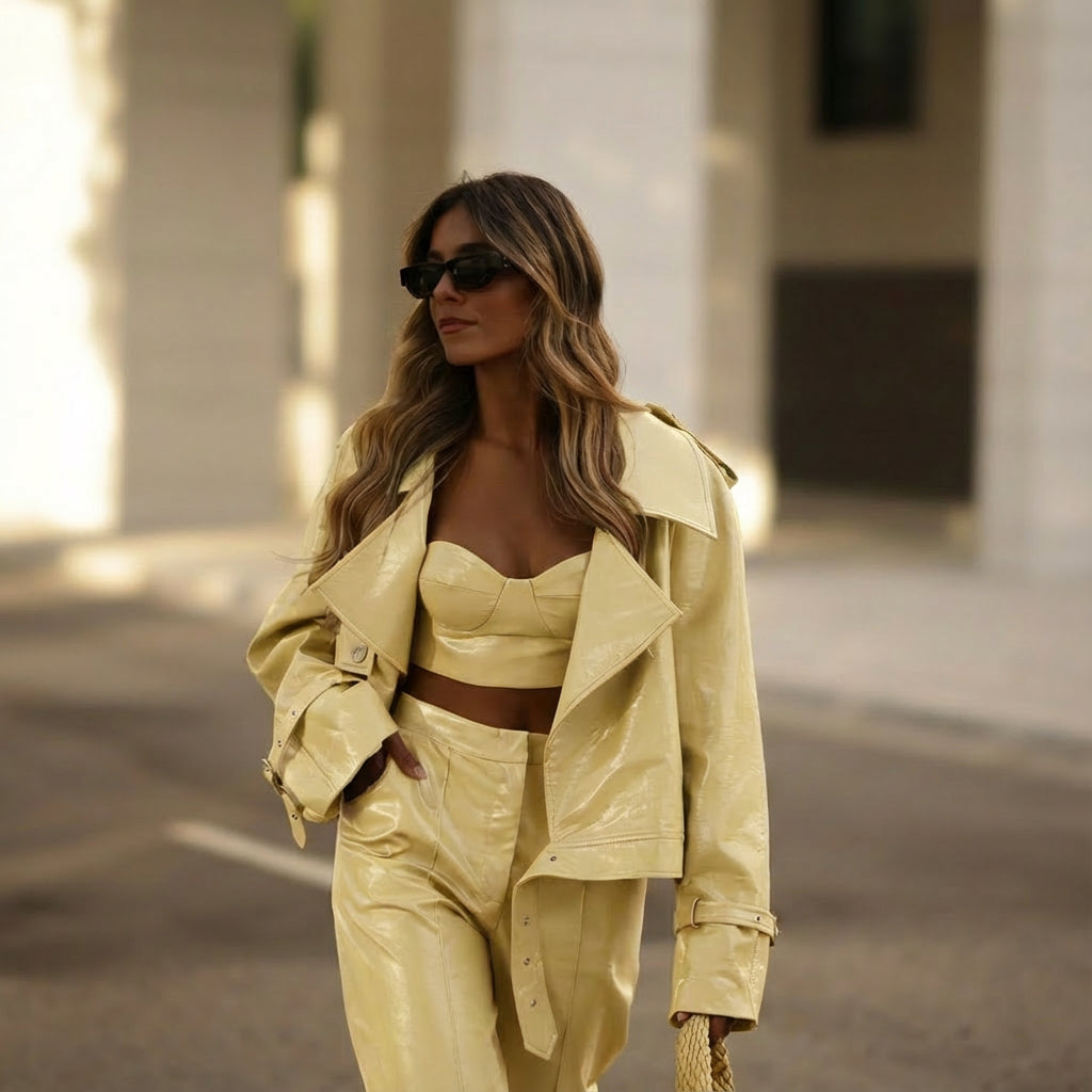 BLUSÃO DE COLARINHO E ABA COM MANGA COMPRIDA. BOLSOS À FRENTE. PORMENOR DE PRESILHAS NO OMBRO. FIVELA NO CINTO.